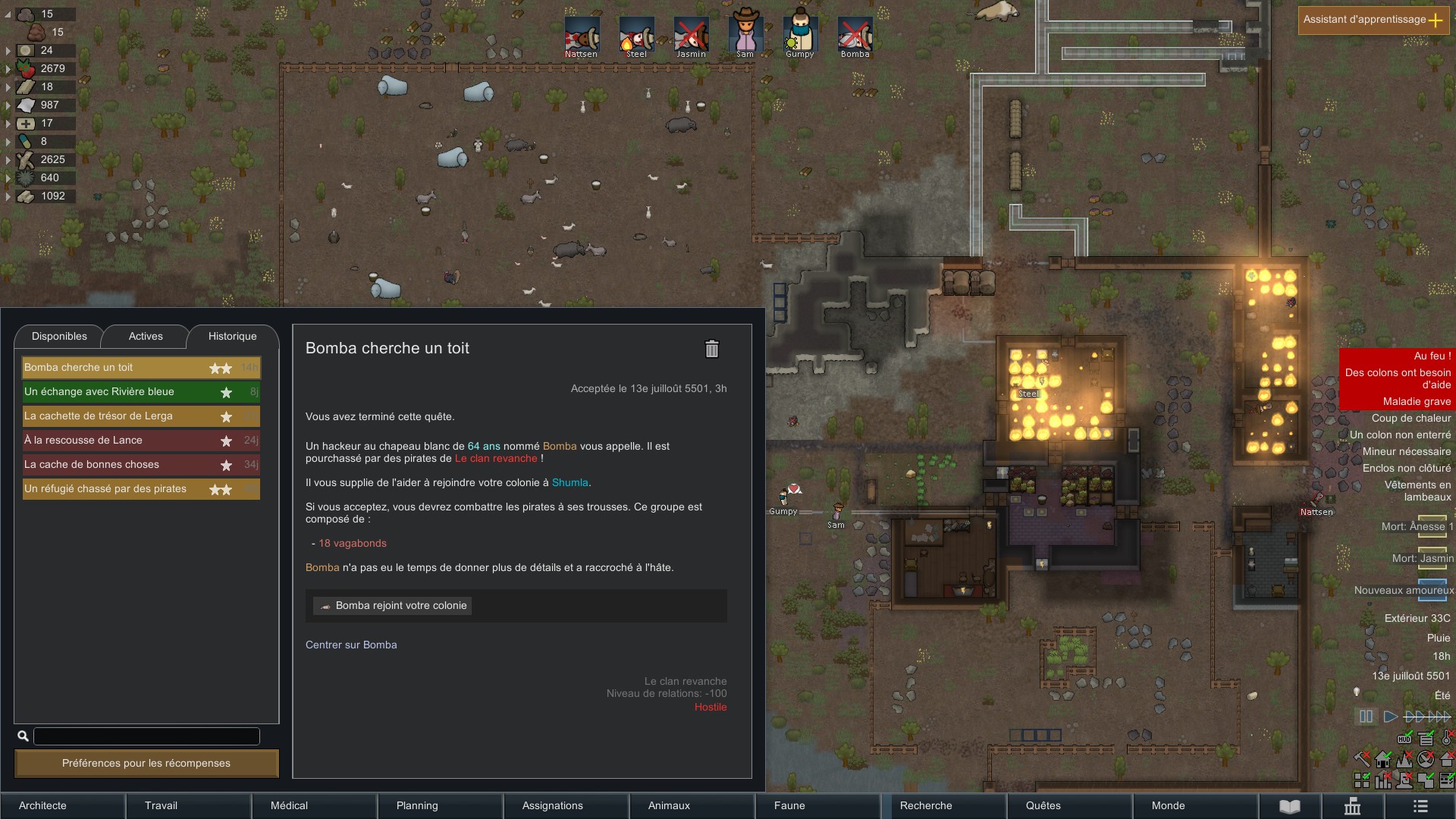 Ils arrivent. Ils sont effectivement 18, mais avec des massues, et du bon côté, c'est bon, c'est gérable. Chaud, mais c'est gérable ? Et le gars a 14 en intelligence, il sait soigner, top ! Par contre, encore un non-violent, il pourra pas aider, on resteà 4 contre 18, chaud ! Ils n'attaquent pas immédiatement mais préparent un siège ? Parfait, je peux me préparer, poser des pièges, nickel, ça sent bon ! C'est quoi ces mortiers qu'ils installent ? Ok, ces blaireaux ont des massues mais 2 mortiers et des livraisons par dropship de munitions pendant plusieurs jours. Ce n'était pas utile : le premier mortier tue le nouveau (!), et les 10 premiers rasent à peu près la base. D'où le screenshot :